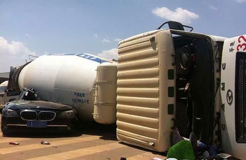 景明北路與陽春大道交叉口處有多條明顯的剎車痕跡,其中一條較寬疑似攪拌車的剎車痕跡長約二三十米。牌照為云ABXX20的攪拌車向右側(cè)翻后,駕駛室受損嚴重,玻璃脫落,車內(nèi)物品散落一地。倒下的罐體壓住了一輛黑色云A6XXVS牌照的寶馬740i轎車,轎車的整個左半邊幾乎被壓平,整車車胎全部爆裂,尤其是駕駛室被壓得最為嚴重,站在車外根本看不見內(nèi)部情況。有現(xiàn)場目擊者稱,當(dāng)時攪拌車側(cè)翻壓到寶馬車之后,車子還往前硬生生推出了近30米。
