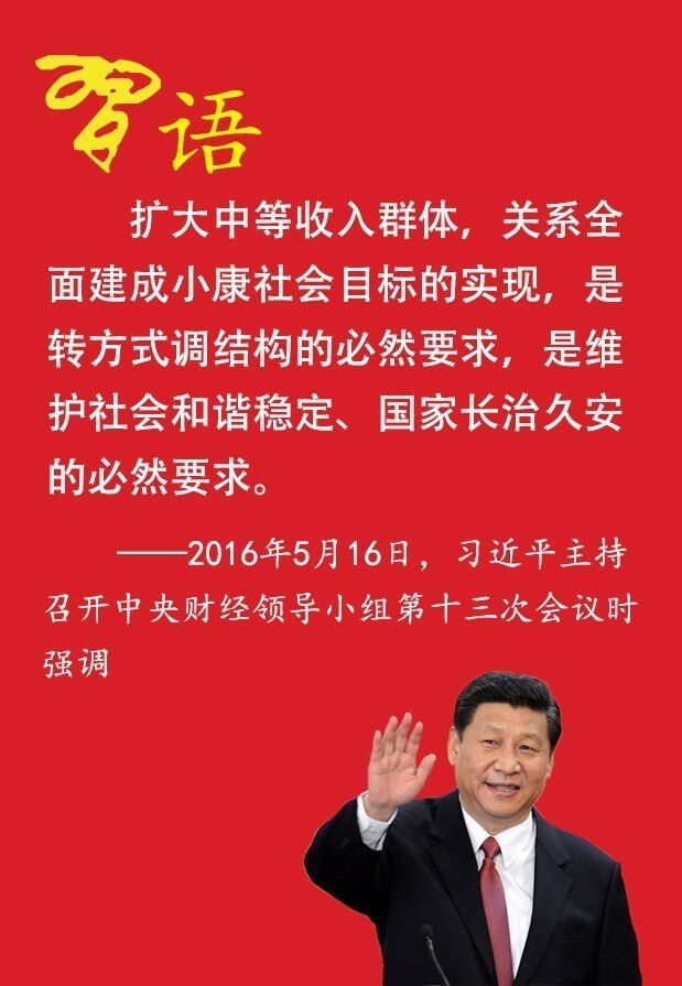 2016年5月16日,習(xí)近平主持召開中央財經(jīng)領(lǐng)導(dǎo)小組第十三次會議,分別研究落實供給側(cè)結(jié)構(gòu)性改革、擴大中等收入群體工作。他強調(diào)要堅持以人民為中心的發(fā)展思想,在全社會大力弘揚勤勞致富、艱苦奮斗精神,激勵人們通過勞動創(chuàng)造美好生活,不斷提高生活水平。