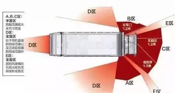 一般情況下,大貨車司機(jī)的視野可分為半盲區(qū)和全盲區(qū)。半盲區(qū)為左車門(mén)1.2米、右前方1.5米、正前方1.2米;全盲區(qū)為車正后方。
