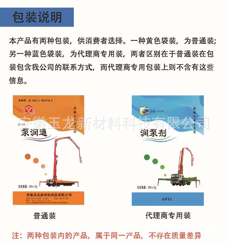 泵車潤管劑(泵潤通)產(chǎn)品使用了可降解彩色復膜包裝,包裝規(guī)格:50袋/箱,300克/袋。本產(chǎn)品應儲存于防曬、通風、干燥處,保質期:三年。