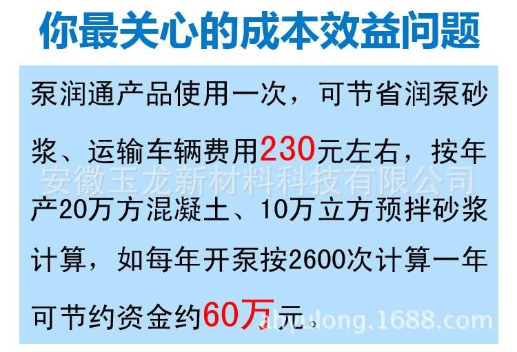 泵潤通產(chǎn)品使用一次,可節(jié)省潤泵砂漿、運輸車輛費用230元左右,按年產(chǎn)20萬方混凝土、10萬立方預拌砂漿計算,如每年開泵按2600次計算一年可節(jié)約資金約60萬元。