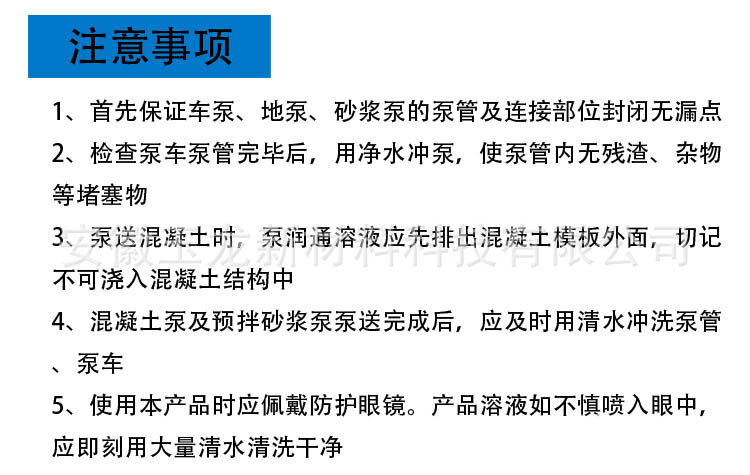 3、泵送混凝土時,泵潤通溶液應先排出混凝土模板外面,切記不可澆入混凝土結構中;