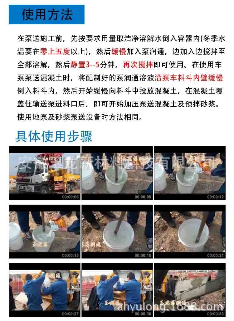 在泵送施工前,先按要求用量取潔凈溶解水倒入容器內,然后均勻緩慢的加入泵車潤管劑(泵潤通),邊加入邊攪拌至全部溶解,然后靜置3分鐘,再次攪拌即可使用。在使用車泵泵送混凝土時,將配制好的潤管劑溶液沿泵車料斗內壁緩慢倒入料斗內并使之滿過泵管進料口,然后開始緩慢向料斗中投放混凝土,同時開始加壓進行混凝土及預拌砂漿泵送作業(yè)。使用地泵作業(yè)時方法相同,但應注意適度調整產(chǎn)品及溶解水的用量。使用地泵時,總長度不得超過100米,如需超過100米地泵使用,則向公司購買地泵專用泵潤通。