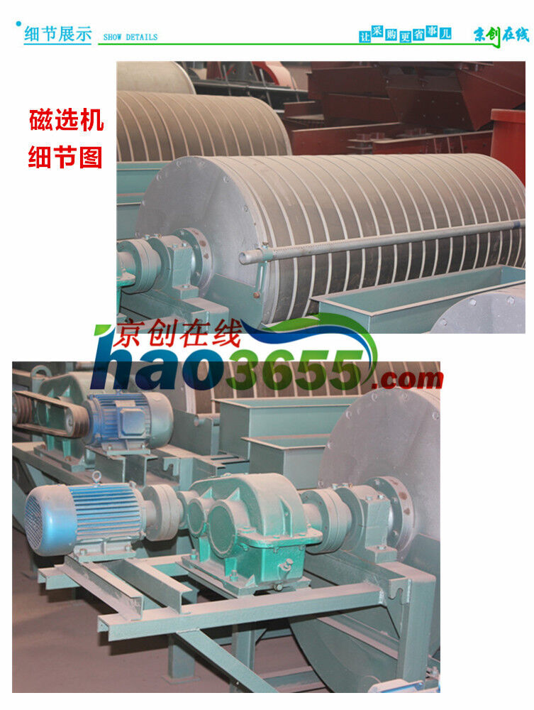 濕式永磁筒式磁選機(jī)主要由圓筒、磁系、槽體、傳動(dòng)部分四部分組成。圓筒由2-3mm不銹鋼板卷焊成筒,端蓋為鑄鋁件,用不銹鋼螺釘和筒相連。電機(jī)通過(guò)減速機(jī),帶動(dòng)圓筒作回轉(zhuǎn)運(yùn)動(dòng)。磁系為開放式磁系,裝在圓筒內(nèi)。磁塊用不銹鋼螺栓裝在磁軛的底板上,磁軛的軸伸出筒外,軸端固定有拐臂。扳動(dòng)拐臂可以調(diào)整磁系偏角,調(diào)整合適后可以用拉桿固定。槽體的工作區(qū)域用不銹鋼板制造,機(jī)架和槽體的其他部分用普通鋼材焊接。