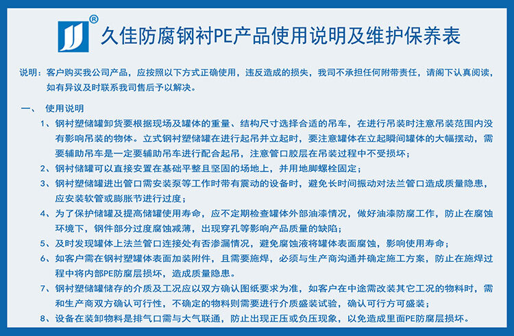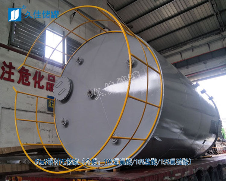 氫氟酸儲(chǔ)罐材質(zhì)  廣東鋼襯PE氫氟酸儲(chǔ)罐廠家 久佳牌 訂制 鋼襯塑酸堿儲(chǔ)存罐特性:鋼襯塑儲(chǔ)罐由于其獨(dú)特的滾塑工藝、產(chǎn)品整體結(jié)構(gòu)和材料優(yōu)異性能,具有整體性好、強(qiáng)度高、無焊縫、不滲漏、抗沖擊、韌性好、重量輕、壽命長(zhǎng)、耐酸堿、耐有機(jī)溶媒、符合衛(wèi)生標(biāo)準(zhǔn)、價(jià)格低廉、規(guī)格品種多等特點(diǎn)。尤其耐腐蝕、長(zhǎng)壽命和大規(guī)格品種有非常大的優(yōu)勢(shì),是貯存和運(yùn)輸各類化工液體半固體的理想產(chǎn)品。其性能大大超過了傳統(tǒng)的玻璃鋼、陶瓷、橡膠、焊接塑料等材料制作的防腐儲(chǔ)罐。已成為傳統(tǒng)防腐儲(chǔ)罐的升級(jí)換代產(chǎn)品,逐漸成為防腐儲(chǔ)罐的首選產(chǎn)品。