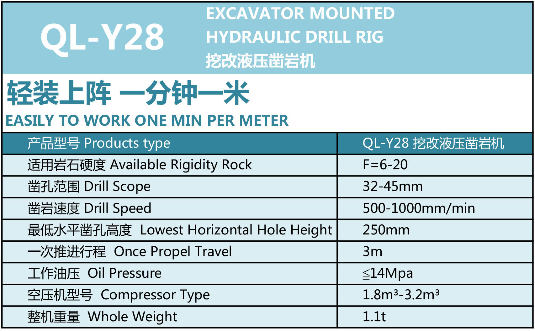 3.挖改液壓鑿巖機的純鑿巖鉆孔速度比同量級氣動鑿巖機快一直三倍。