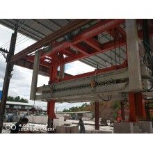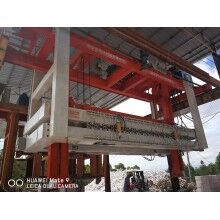 移動(dòng)式掰板機(jī)工作流程:蒸養(yǎng)完成的成品連同模具側(cè)板被模具側(cè)板運(yùn)輸裝置送至移動(dòng)掰板機(jī)下,頂升裝置啟動(dòng),將坯體連同側(cè)板頂起,移動(dòng)掰板機(jī)從上層至下層依次掰開,掰至底層后,移動(dòng)掰板機(jī)將全部成品夾起,并移至砌塊成品打包線上,將砌塊放置在該打包線上,移動(dòng)掰板機(jī)繼續(xù)將加氣板移動(dòng)至加氣板輸送打包線上,重新返回。掰扳機(jī)專門負(fù)責(zé)坯體切開之后(經(jīng)蒸養(yǎng))又重新粘連在一起,在自動(dòng)打包之前將其一塊一塊分離,消除由于粘連造成的廢、次品,同時(shí)保證打包線正常運(yùn)行。