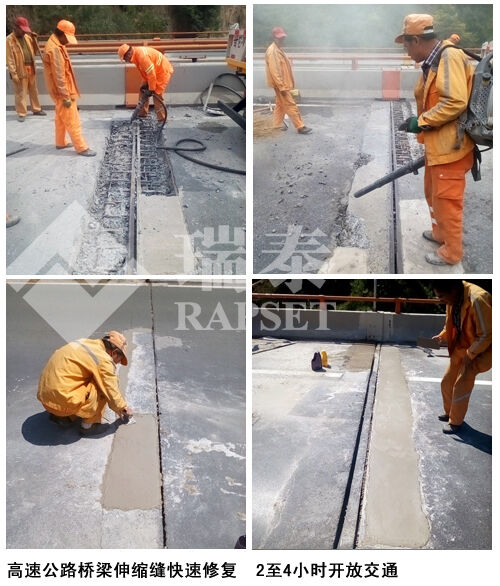 養(yǎng)護人員到達現(xiàn)場,對破損混凝土進行鑿除,將伸縮縫內部斷裂的鋼筋電焊連接好,然后將搶修寶材料按照一定的水灰比攪拌均勻,澆筑于伸縮縫坑槽內,用振搗棒進行適當振搗,然后迅速收面,初凝后,開始灑水養(yǎng)生,2小時后,完全可以通行。目前,所有路段均已施工修復完畢。產(chǎn)品品質以及材料實用性獲得了局領導以及養(yǎng)護工人的一致好評。