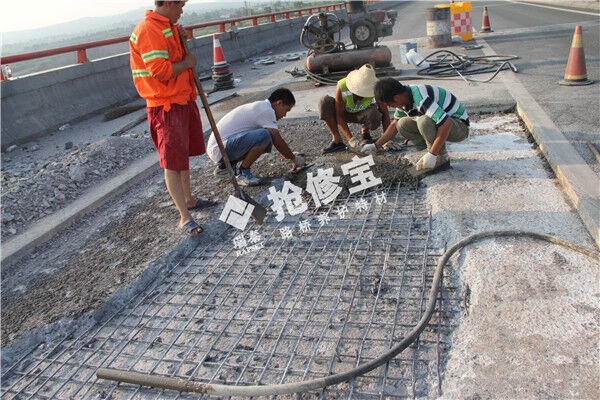 由于時(shí)間要求快,應(yīng)采用混凝土特種材料進(jìn)行搶修,路橋養(yǎng)護(hù)特材——搶修寶RT-2,30分鐘速凝,2小時(shí)可通行,早期強(qiáng)度高、后期強(qiáng)度不倒縮,粘結(jié)能力強(qiáng),是治理橋梁路面鋪裝層病害常備的特種建材,采用風(fēng)鎬對鋪裝層病害進(jìn)行清除,破碎時(shí)注意水平方向分離鋪裝層與梁板,不能影響梁板的狀態(tài)和質(zhì)量,對梁板頂要清除整潔,用氣泵或高壓水對梁板頂進(jìn)行沖洗,不積水不滲漏的情況下,采用搶修寶RT-2特種水泥與標(biāo)準(zhǔn)石子按照要求配比,加水?dāng)嚢?,迅速澆注到病害部位,抹至與路面齊平時(shí),灑水量水進(jìn)行收光,指甲掐不動(dòng)混凝土?xí)r進(jìn)行養(yǎng)護(hù),2小時(shí)后即可通行。避免大面積換板,降低了工程成本。施工無需動(dòng)用大型機(jī)械,對交通安全影響不大。