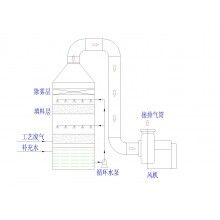 內(nèi)設逆向填料吸收系統(tǒng)、噴淋系統(tǒng)、脫霧裝置系統(tǒng)、下設供水箱、供水泵系統(tǒng)、進出風口、風機、風管、吸罩組成系統(tǒng)。