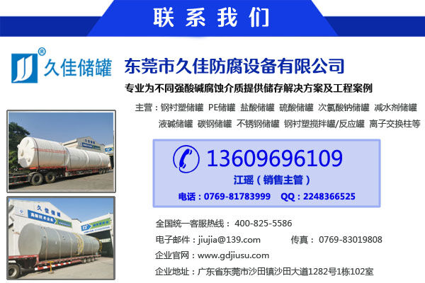 找質(zhì)量上乘、服務(wù)一流的鋼襯塑樹脂罐攪拌罐供應(yīng)商,選東莞市久佳防腐設(shè)備有限公司,公司是華南地區(qū)知名的防腐鋼襯塑攪拌罐生產(chǎn)廠家,引進(jìn)國外先進(jìn)的技術(shù)設(shè)備以及滾塑工藝,品質(zhì)保證。生產(chǎn)的防腐攪拌罐、鋼襯塑儲罐具有無焊接縫、不滲漏、耐腐蝕,抗老化,抗沖擊,表面光滑結(jié)合力強(qiáng)。對一般酸堿鹽的有機(jī)溶劑性能良好,適用于腐蝕性氣體,液體及固體液,漿液介質(zhì)的攪拌以及儲存輸送。