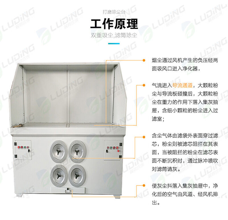 除塵工作臺(tái)是工業(yè)環(huán)保設(shè)備的一種,它集工作臺(tái)和除塵器為一體,在臺(tái)面上進(jìn)行打磨、拋光、焊接操作的同時(shí),產(chǎn)生的煙霧粉塵就被下方的吸塵裝置吸除并凈化,凈化后的空氣直接排放到車間內(nèi)進(jìn)行循環(huán)利用。