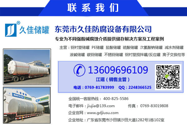 東莞市久佳防腐設(shè)備有限公司——專注危化品防腐容器儲(chǔ)存安全。集研發(fā)、設(shè)計(jì)、生產(chǎn)、銷售于一體的化工設(shè)備防腐制造商,公司地處珠三角幾何中心虎門港,地理位置優(yōu)越,交通四通八達(dá)。公司占地面積8000余平方米,擁有多臺(tái)大型滾塑機(jī)和小型滾塑機(jī),并有100多臺(tái)生產(chǎn)加工和檢驗(yàn)檢測設(shè)備。東莞市久佳防腐設(shè)備有限公司主要生產(chǎn)久佳防腐鋼襯塑儲(chǔ)罐、管口一體成型PE儲(chǔ)罐、碳鋼儲(chǔ)罐、不銹鋼儲(chǔ)罐、反應(yīng)釜攪拌罐、離子交換柱、鹽酸/硫酸/酸堿儲(chǔ)罐等五大材質(zhì)100多種規(guī)格,規(guī)模和產(chǎn)品質(zhì)量在國內(nèi)同行處于優(yōu)勢地位。