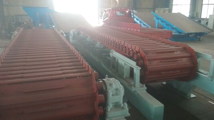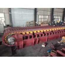 負(fù)荷鏈板材料選用優(yōu)質(zhì)合金鋼板沖壓而成。給料板式給料機(jī)每塊負(fù)荷鏈板上焊有折彎角鐵,既能滿足大傾角向上運(yùn)送物料,又提高負(fù)荷鏈板的強(qiáng)度。在鏈板寬度較寬的情況下增加輔助支撐,該項(xiàng)結(jié)構(gòu)不但增加了鏈板的強(qiáng)度,而且使運(yùn)輸過程更加平穩(wěn)可靠。拉料板式給料機(jī)為了增加鏈板表面的摩擦,防止物料打滑,在負(fù)荷鏈板上增加了一定數(shù)量的耙齒,對防止搭橋有一定的緩沖作用,保證了給料的均勻性。
