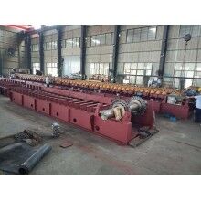 座部件由機(jī)架和支承件組成。機(jī)架由鋼材焊接而成,支承部件有支重輪、下托輪和縱向?qū)к?,輸送板得到支重輪和縱向?qū)к壍碾p重支持,使支重更均勻合理。牽引鏈基本上不受礦石和自重產(chǎn)生的張力作用,支重輪外側(cè)設(shè)計有凸臺,與主、從動輪聯(lián)合作用,成功地杜絕鏈軌跑偏。在機(jī)架下方設(shè)有下托輪,為方便維修,下托輪為側(cè)裝式。