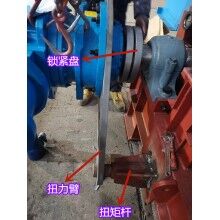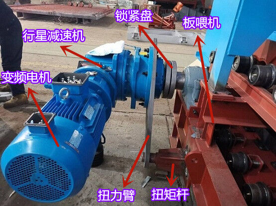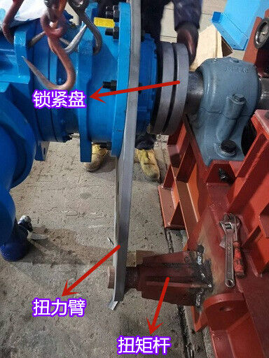 驅(qū)動(dòng)機(jī)構(gòu)由電機(jī)、減速機(jī)、鎖緊盤(pán)和扭力裝置組成,驅(qū)動(dòng)機(jī)構(gòu)通過(guò)鎖緊盤(pán)帶動(dòng)鏈輪軸旋轉(zhuǎn),從而對(duì)物料進(jìn)行輸送。為了抵抗驅(qū)動(dòng)機(jī)構(gòu)隨鏈輪軸旋轉(zhuǎn)的力,扭力裝置需要固定在地基上或者機(jī)架上。