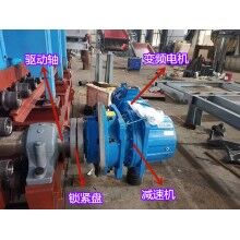 3)采用變頻調(diào)速電動(dòng)機(jī)通過(guò)彈性柱銷(xiāo)聯(lián)軸器與軸裝式減速機(jī)直聯(lián),主傳動(dòng)軸直接串在減速機(jī)的空心輸出軸內(nèi),通過(guò)鎖緊盤(pán)(漲套)聯(lián)接。由于減速機(jī)采用懸掛軸裝式結(jié)構(gòu),傳動(dòng)裝置整體為懸掛式,安裝就位時(shí)可將減速機(jī)支架與主機(jī)機(jī)架簡(jiǎn)易連接或在減速機(jī)支架下設(shè)置簡(jiǎn)易力臂式支座與地面連接,支座根據(jù)現(xiàn)場(chǎng)條件制作。