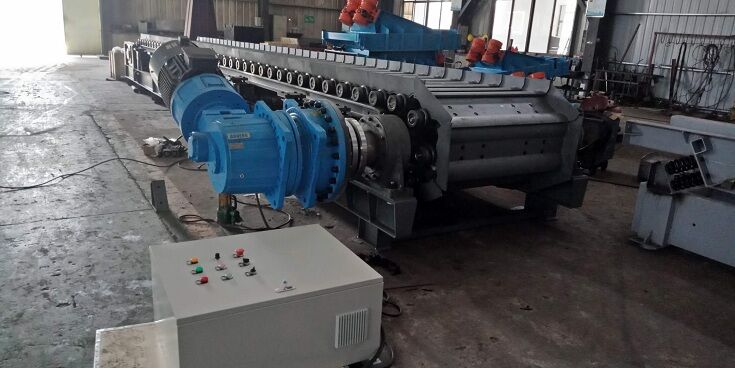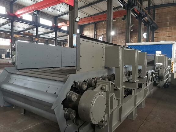 張緊裝置既是鏈板組件的張緊組件,又是改向軸組件的支承組件。它主要由座架及滑動(dòng)支承座組成,后部設(shè)能帶動(dòng)滑動(dòng)支承座前后移動(dòng)的調(diào)節(jié)桿,可對(duì)滑動(dòng)支承座前后調(diào)節(jié),以保持鏈軌合適的張緊度。