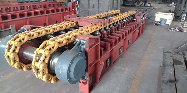 座部件由機(jī)架和支承件組成。機(jī)架由鋼材焊接而成,支承部件有支重輪、下托輪和縱向?qū)к墸斔桶宓玫街е剌喓涂v向?qū)к壍碾p重支持,使支重更均勻合理。牽引鏈基本上不受礦石和自重產(chǎn)生的張力作用,支重輪外側(cè)設(shè)計(jì)有凸臺(tái),與主、從動(dòng)輪聯(lián)合作用,成功地杜絕鏈軌跑偏。在機(jī)架下方設(shè)有下托輪,為方便維修,下托輪為側(cè)裝式。