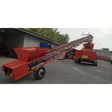 新型履帶移動式堆料機,以皮帶輸送機的物料輸送功能為主體,皮帶輸送機的兩端分別設(shè)置有傳統(tǒng)的入料裝置和出料裝置。其特征在于,還包括履帶底盤和行走輪,皮帶輸送機的一端通過轉(zhuǎn)盤機構(gòu)與履帶底盤連接,皮帶輸送機的另一端通過鉸接機構(gòu)與行走輪連接,整個裝置由液壓馬達驅(qū)動履帶行走,動力可采用柴油發(fā)動機或外接電源。