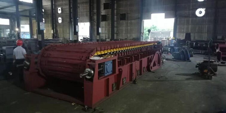 2)經(jīng)過(guò)浮選機(jī)進(jìn)行浮選的金礦粉料,加入了浮選藥劑,物料濕度較大,有粘性,同時(shí)有可能結(jié)成塊狀。由于物料的特殊性這道工序的配套輸送設(shè)備比較關(guān)鍵:料斗一次抓料十多噸,物料對(duì)輸送機(jī)有較大的沖擊力。所以這道工序選擇的輸送機(jī)要能承受物料沖擊,也要能輸送粘性物料,同時(shí)該輸送機(jī)具有打散功能,把結(jié)成塊的物料打散。這道工序的輸送機(jī)通常采用我公司研制的新型皮帶板式給料機(jī),可滿足以上要求。