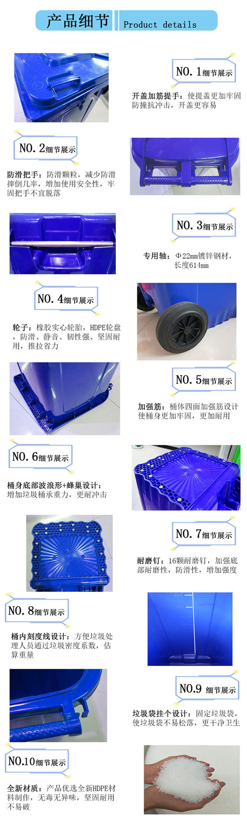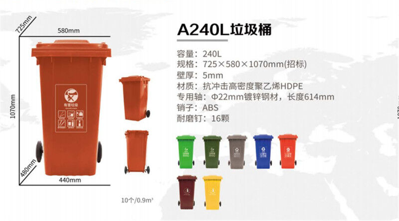 240L塑料垃圾桶/塑料環(huán)衛(wèi)垃圾桶,桶蓋密合,可防止異味散發(fā),雨水侵入,蚊蠅滋生,桶身可相互套疊,方便運(yùn)輸,節(jié)省儲(chǔ)運(yùn)空間與費(fèi)用,桶內(nèi)外表面光潔,便于倒空垃圾與清洗,垃圾桶設(shè)計(jì)符合 人體工程學(xué),輕便耐用,移動(dòng)靈活。產(chǎn)品賣點(diǎn)。240L塑料垃圾桶價(jià)格不浪費(fèi),讓城市更美觀少占地:生活垃圾中有些物質(zhì)不易降解,使土地受到嚴(yán)重侵蝕。垃圾分類,去掉能回收的,不易降解的物質(zhì),減少垃圾數(shù)量達(dá)50%以上。少環(huán)境污染:廢棄的電池含有金屬。約資源鎘等有害的物質(zhì)。