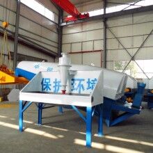 落地式砂石分離機整套系統(tǒng)主要由:攪拌車加水清洗裝置,溜槽裝置,砂石漿水分離裝置,和泥漿水后處理裝置組成?;炷凛斔驮O(shè)備清洗后,將殘余混凝土排入溜槽中,在高壓水流沖擊下,經(jīng)溜槽進入砂石分離機,在不斷旋轉(zhuǎn)的分離機作用下,對混凝土進行充分的清洗,同時將砂石、漿水進行分離,分離后的砂、石在導(dǎo)料葉片的作用下背向流動至出料口排出分離機落入振動篩分機,通過篩分將沙、石子分開,分別堆放。清洗后的漿水從分離機的溢水口排出進入濃漿池,經(jīng)污水泵加壓打到旋流器除去多余固體微粒,降低漿水濃度,進入攪拌池回收利用。進入攪拌池的漿水為了防止沉淀凝固,需通過攪拌器的作用,攪拌器的工作為間歇式。分離出水泥漿在連續(xù)的攪拌器作用下,再通過高壓污水泵輸送到攪拌樓中待生產(chǎn)再利用。整個控制系統(tǒng)設(shè)有手動和自動控制,方便控制設(shè)置,整個系統(tǒng)運行可靠,故障率低,維護量少等特點。