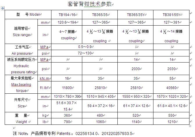 TB套管背鉗為專利產品,可與油田現使用的各類套管動力鉗配合進行下套管作業(yè),能提高管柱絲扣聯接質量,減少主鉗大扭矩作業(yè)的變形,提高作業(yè)的安全性、可靠性,減輕工人勞動強度,提高作業(yè)效率。該產品按控制方式有全氣、液控兩種。設有扭矩傳感器,可精確測出管柱聯接的扭矩。表中為背鉗參數。動力鉗符合SY/T5074標準和API Spec 7K規(guī)范。