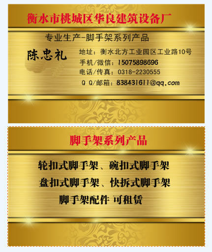 河北衡水華良建筑設備廠是一家專業(yè)的腳手架、輪扣腳手架、碗扣腳手架、腳手架配件等產(chǎn)品的腳手架生產(chǎn)廠家,公司積累了多年的腳手架技術經(jīng)驗,真誠歡迎新老客戶來電咨詢:150-7589-8696