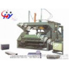靜停養(yǎng)護達到切割強度后,模框由翻轉(zhuǎn)行車吊運至切割機工位上,翻轉(zhuǎn)吊具將??蚍D(zhuǎn)90°放在切割小車支座上,然后由翻轉(zhuǎn)吊具機械手自動開啟模框、脫模,把坯體連同側(cè)板側(cè)立在第一輛切割小車上,脫下的??蚯謇砗笈c蒸養(yǎng)返回的經(jīng)清理噴油后的側(cè)板組合成模具,等待澆注。在組模的同時,脫模后的坯體在切割機上分部做定點切割,首先第一輛切割小車帶動坯體行走經(jīng)過縱切裝置進行縱向切割,坯體在進行縱向切割時,分別由切割刀片和由汽缸張緊的切割鋼絲同時完成側(cè)面、面包頭及頂面廢料的切割與清理,縱切結(jié)束后,切割小車?yán)^續(xù)行走至橫切裝置中央位置停止,橫切架自上而下垂直降落進行坯體的橫向切割,橫切時切割鋼絲作鋸裝擺動,完成坯體的鋸裝橫向切割。坯體切割完成后,人工推鏟出去頂部面包頭。小車置換裝置啟動,由切割機下方小車置換油缸將切割好的坯體連同側(cè)板頂起,下方第一輛小車返回起始位置,去承載新的帶切割的坯體,第二輛小車替換第一輛小車位置,并承載坯體及側(cè)板行走至預(yù)定位置,最后坯體由半成品吊車連同地板吊運至釜前蒸養(yǎng)小車上,在軌道上進行編組。