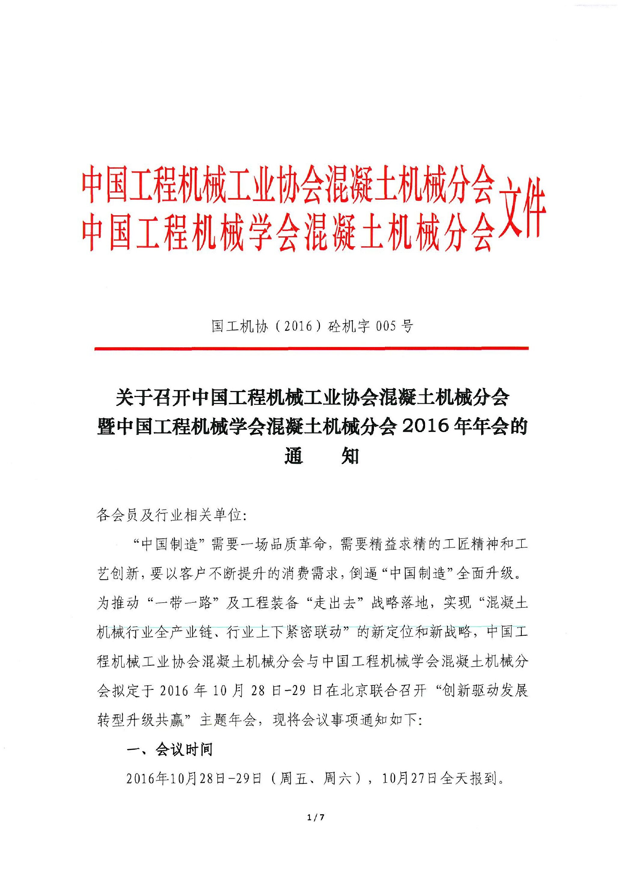關(guān)于召開中國工程機械工業(yè)協(xié)會混凝土機械分會暨中國工程機械學(xué)會混凝土機械分會2016年年會的通知