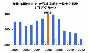 根據(jù)相關(guān)數(shù)據(jù)統(tǒng)計(jì),2006年歐盟預(yù)拌混凝土年產(chǎn)量3.96億立方米,達(dá)到近年高峰值,之后產(chǎn)量逐年下降,2012年預(yù)拌混凝土年產(chǎn)量僅2.4億立方米。