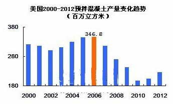 美國2000-2012年預(yù)拌混凝土產(chǎn)量變化趨勢(百萬立方米)