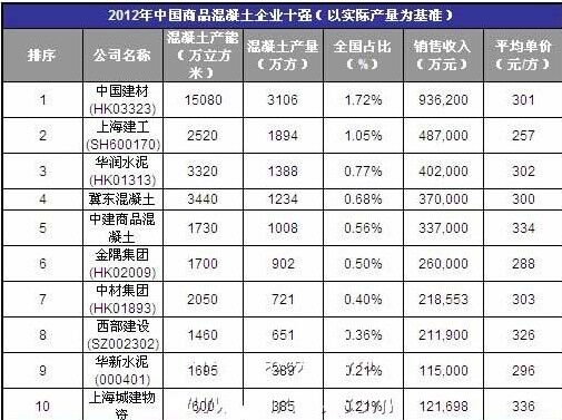 2012中國商品混凝土企業(yè)十強(qiáng)(以實(shí)際產(chǎn)量為基準(zhǔn))