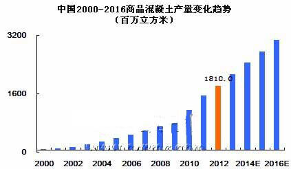 中國商品混凝土市場自2000年開始,增長就大幅度提升,2000-2012年平均增幅高達(dá)30%左右。但受全球經(jīng)濟(jì)危機(jī)的影響,中國2008年的商品混凝土市場也受到了不小的沖擊,商品混凝土的增長率大幅度下滑。不過與歐盟、美國等其他發(fā)達(dá)國家混凝土負(fù)增長率而言,中國混凝土市場表現(xiàn)的還是十分活躍的。這也反映出了中國的商品混凝土行業(yè)進(jìn)入高速發(fā)展時(shí)期的特征。但中國市場目前的市場狀況十分紊亂,行業(yè)內(nèi)需要進(jìn)行一番整合,清理一些市場上不規(guī)范的企業(yè),相信整合后對我國商品混凝土行業(yè)將起到較大的推動(dòng)作用。中國混凝土網(wǎng)預(yù)計(jì)“十二五”期間,預(yù)拌混凝土產(chǎn)量還將有小幅增長,到2016年中國預(yù)拌混凝土產(chǎn)量將突破30億立方米,混凝土行業(yè)將邁上一個(gè)新的臺階,但總體行業(yè)回歸平穩(wěn)狀態(tài)。