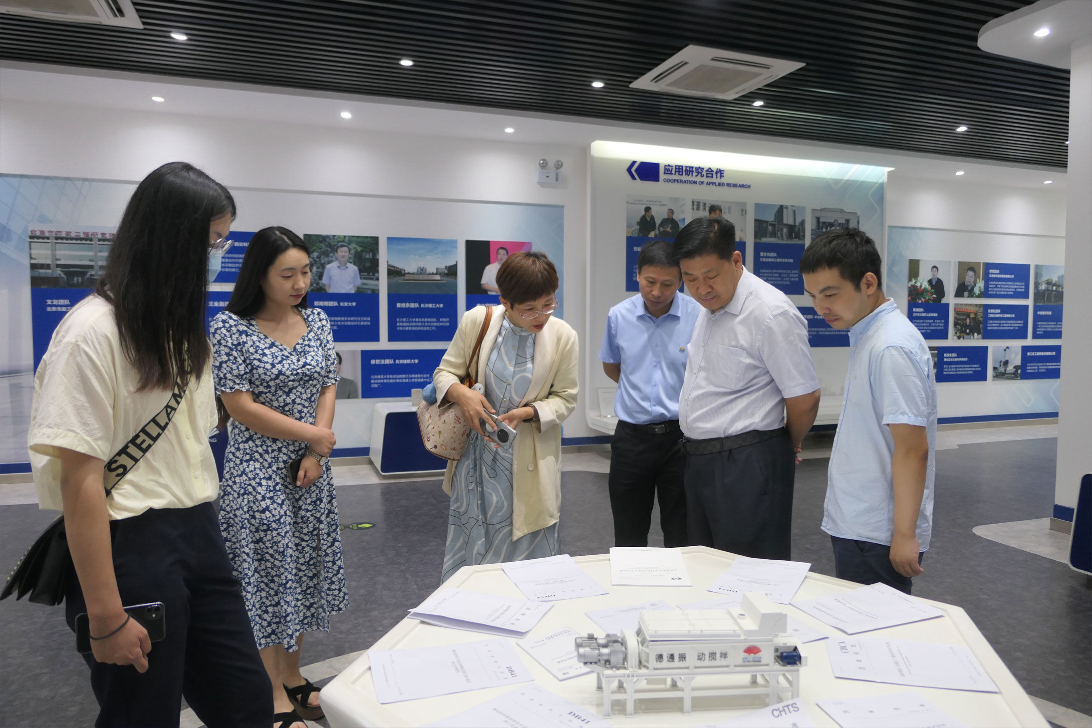 公司副總經(jīng)理孔鮮寧等陪同符忠軒會(huì)長(zhǎng)一行參觀德通多媒體展廳,匯報(bào)振動(dòng)攪拌技術(shù)研發(fā)及應(yīng)用成果。
