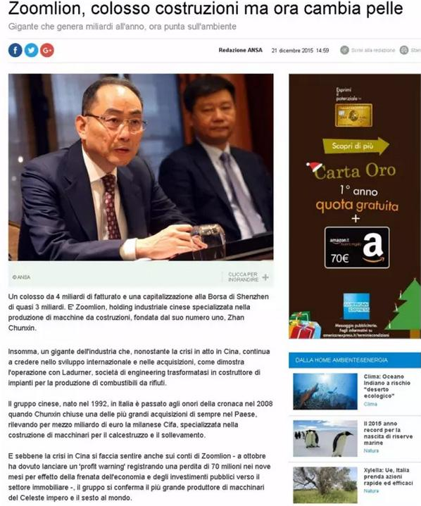 意大利知名國際通訊社安莎通訊社(Agenzia nazionalestampa associata,ANSA)今日在其網(wǎng)站首頁連續(xù)重磅發(fā)布三篇報(bào)道,聚焦中國企業(yè)中聯(lián)重科收購意大利領(lǐng)先環(huán)保企業(yè)LADURNER(納都勒)公司,中聯(lián)重科董事長詹純新,公司副總裁、環(huán)境集團(tuán)總裁張建國接受了安莎社記者的專訪。